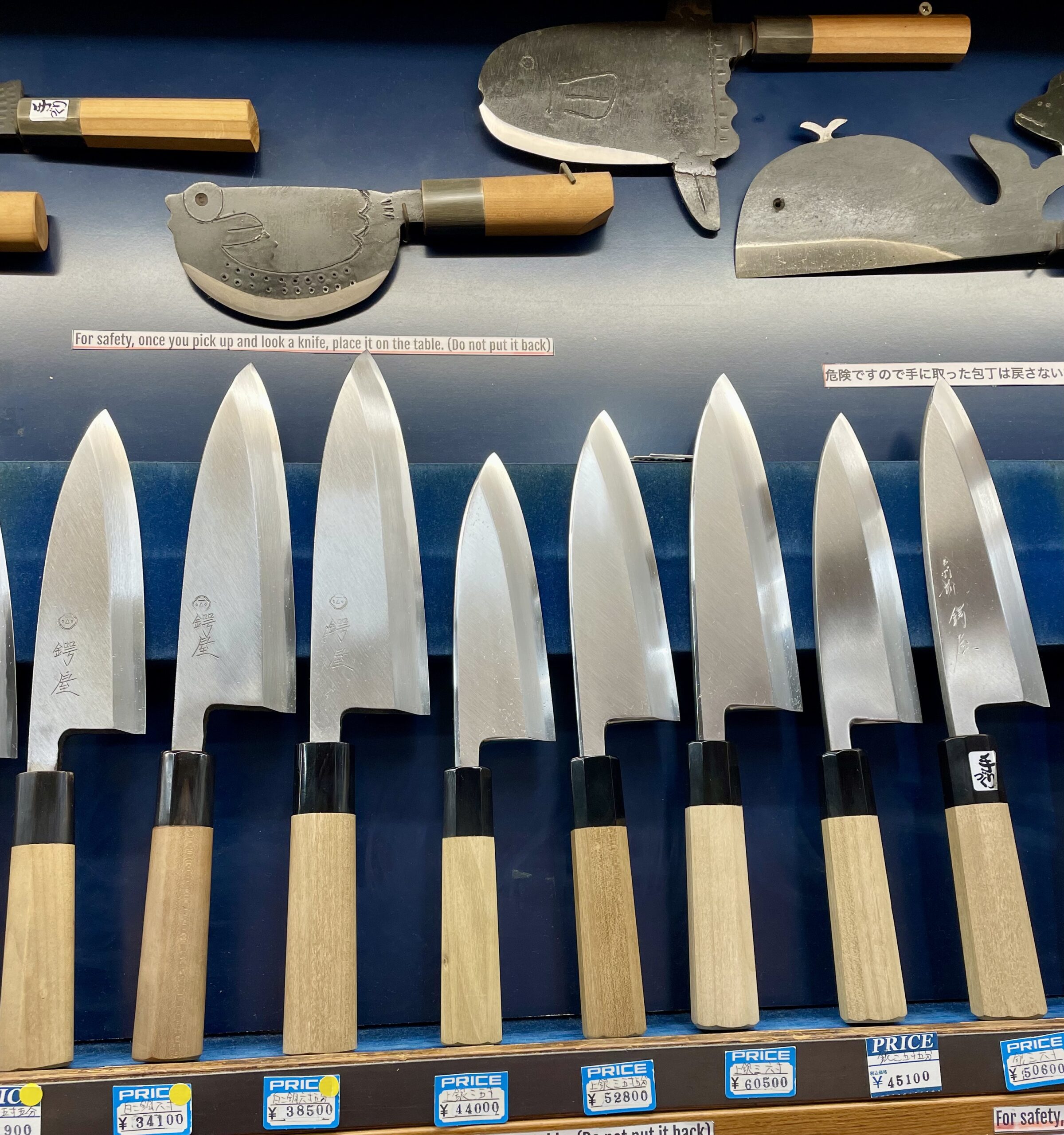 Los cuchillos son la posesión más preciada de alguien que se dedique a la cocina en Japón. Viajan con ellos como un amuleto, ya que les permite demostrar su destreza donde sea el restaurante al que vayan. Y la especialización de estas herramientas es extrema. Cada tipo de cuchillo está pensado para una tarea culinaria concreta. Así, Yanagiba (literalmente Hoja de sauce) es un cuchillo largo y estrecho, usado para sashimi y pescado crudo y tiene variaciones específicas según la fuerza que requiera el corte: para atún (magurobocho), para pez globo (fuguhiki), para pulpo (takohiki)… Luego hay otros cuchillos para anguila, denominados unagisaki.