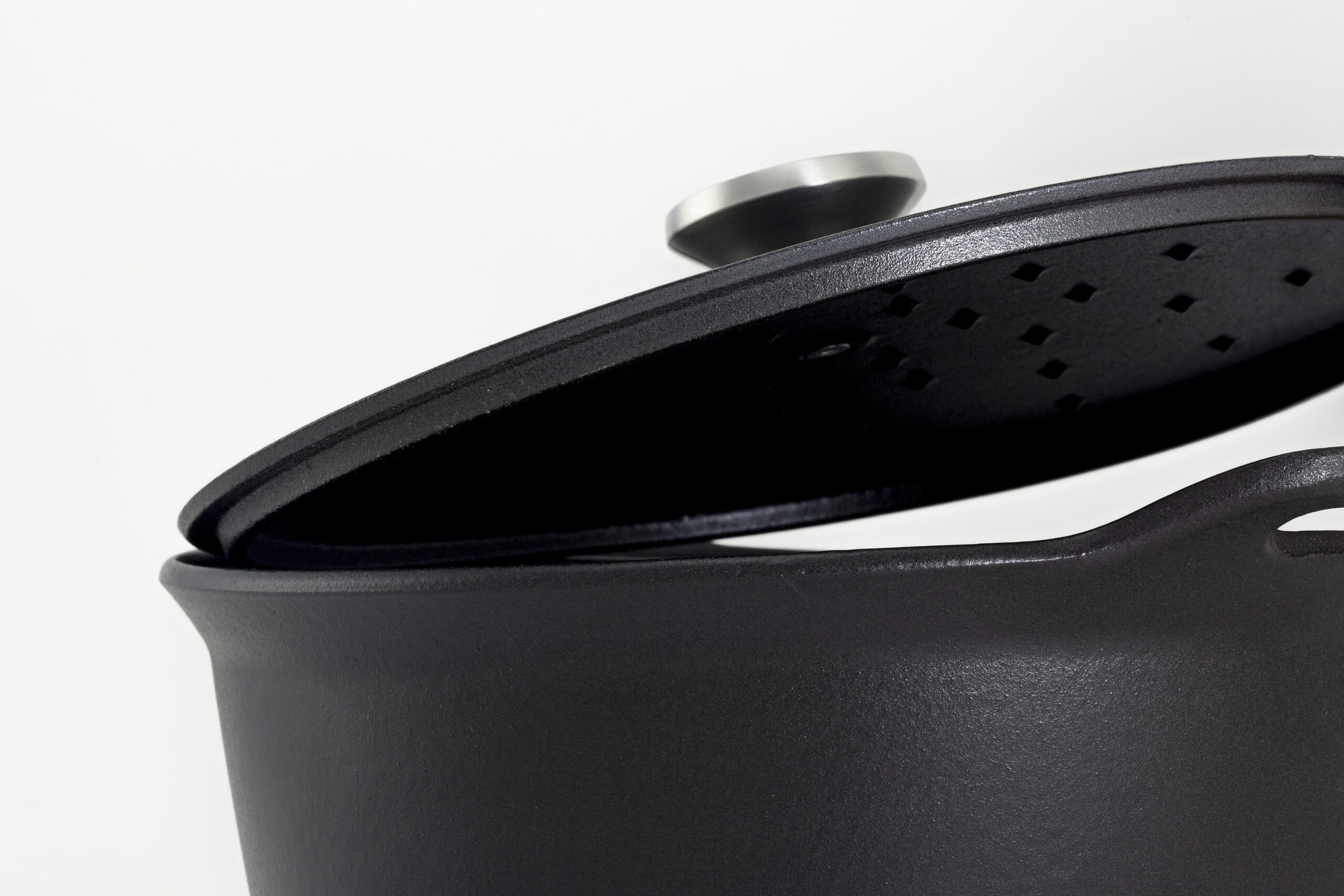 Aunque obviamente hay avances sobre el hierro viejuno. Además de la estética colorista, uno importante es la calidad de los esmaltados del interior de los cacharros. El esmalte cerámico es un gran conductor de calor, y garantiza la protección del hierro fundido ante el óxido o la corrosión. Asimismo, la cerámica evita que los alimentos absorban ningún tipo de sabor metálico y es antiadherente. Eso lo ofrecen todas las cocottes de las marcas premium, pero la firma cántabro-estadounidense ha patentado algo útil para que no rebosen los líquidos manchando la encimera: el sistema de giro Helix Dripless Lid o «tapadera en hélice sin goteo”. Estas tapas especiales evitan la costumbre de dejar medio abierta una cazuelaal cocinar: con un simple giro de la tapa, la cazuela queda semiabierta dejando escapar parte del vapor y la temperatura. Otra cosa interesante es que el interior de las gruesas tapas está cubierto por puntos de distribución de la condensación que retienen los jugos que se evaporan al cocinar y estos gotean sobre los alimentos, regándolos con su propio esencia para una cocción que resulte perfecta y sabrosa.